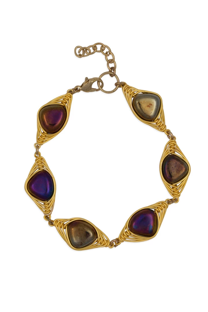 - Necklace made of iridescent glass beads wrapped in gold-tone copper metal wire