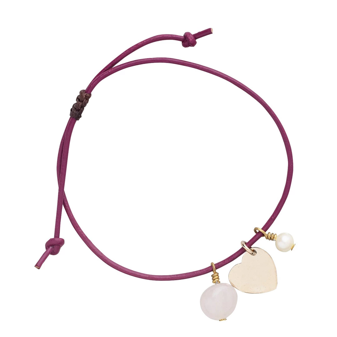 A metallic heart dangles alongside a bead of rose quartz and a faux pearl. Rose quartz is sometimes called the “love stone,” and is said to speak to the heart chakra. Crafted by the artisans of Sapia. A beautiful Global Fair Trade gift.