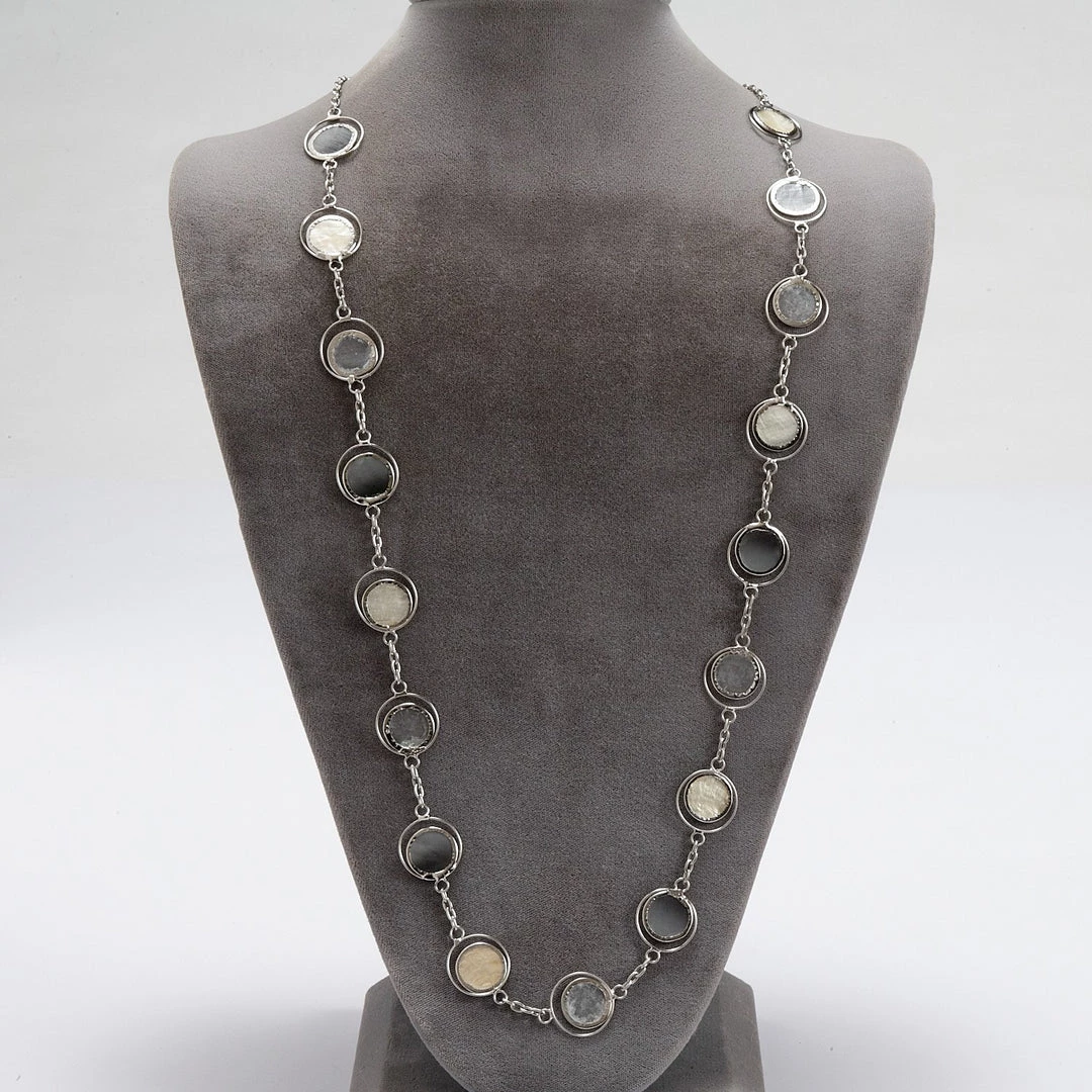 Delicate in pearly white, this stunning necklace is made from capiz, the thin shell of a marine mollusk. First artisans wash and soak shells. After the shells have dried, they are cut into shapes and edged with metal wire. A finishing coat of varnish completes this labor-intensive process. Before glass windows became available in the Philippines, capiz was used for windows in houses. A beautiful Global Fair Trade gift.