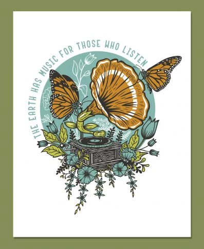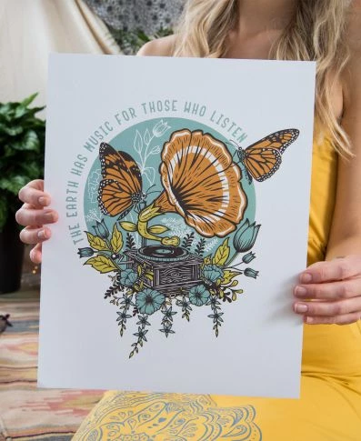 The earth has music for those who listen. This Gramophone poster is filled with butterflies, nature, and an old phonograph. Feel musically inspired when you hang this poster on your wall. Made in the USA. 100% recycled heavyweight paper. Textured Finish. 11 x 14 inches.
