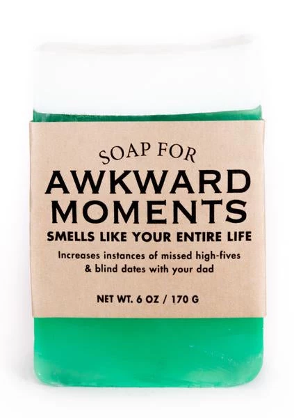 “Um, awkwaaard. Ah, memories. Look, everyone has a few awkward moments in their past. Flat-out embarrassing and impossible to shake off, this is the stuff life is made of. I should know. I clock in two or three of these every few minutes, and that’s just on Twitter. In real life, I’m a complete train wreck. And proud of it! You should be, too. That’s why you need a special Soap for Awkward Moments. It’s not as cool as a national holiday, but it’s a damn good start.”