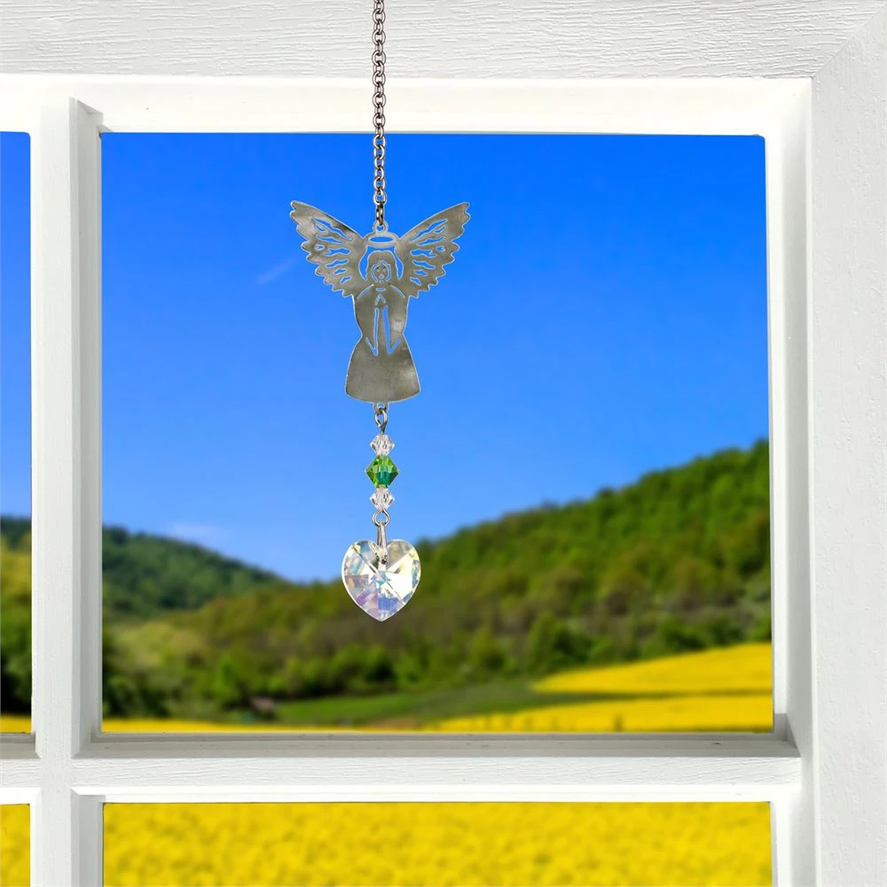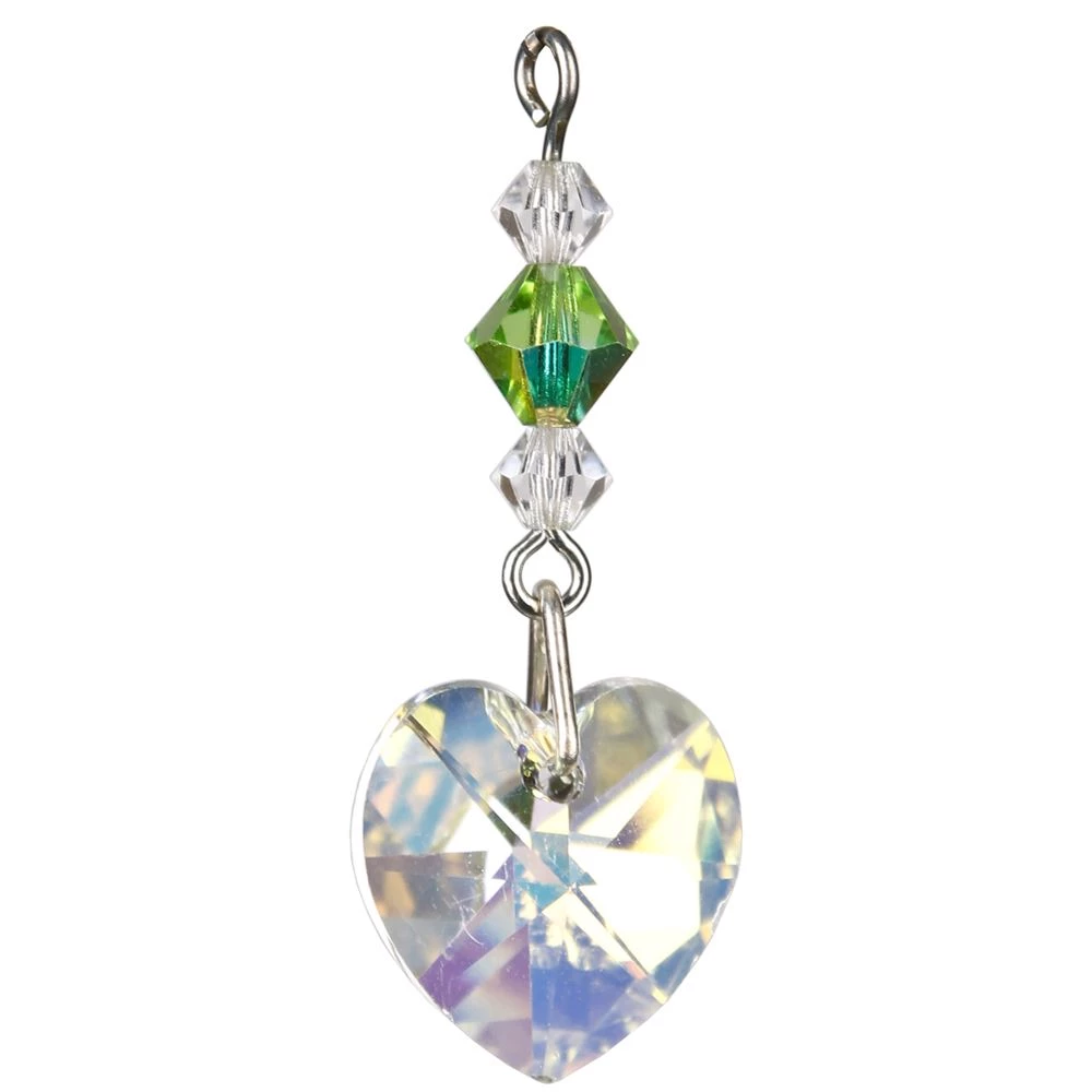 A beautiful angel ornament, accented by a peridot green birthstone crystal, leads to an aurora borealis heart. The August Birthstone Angel Suncatcher makes a great, personal gift, specially chosen with the recipient in mind. Genuine Austrian crystals sparkle and shine in the sun and gift is recommended for indoor use. Measures 3″ long, overall length 8.5″ with hanging chain and hook.