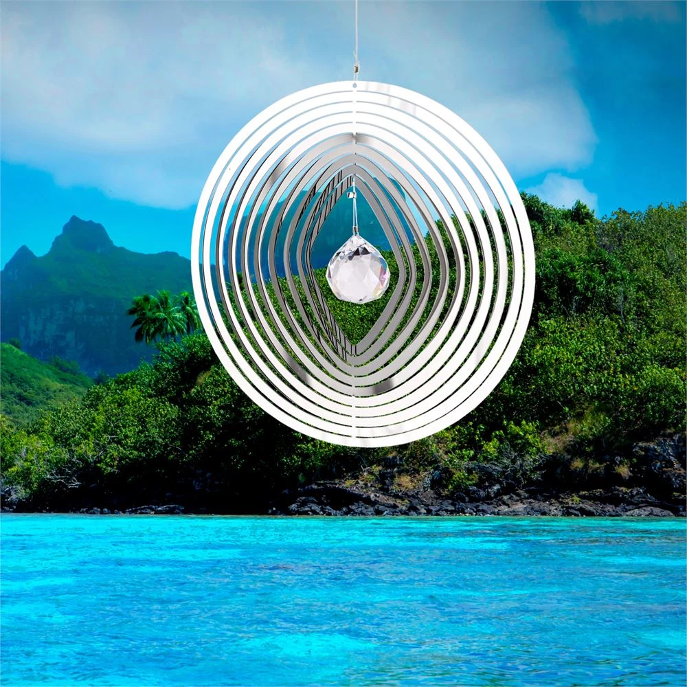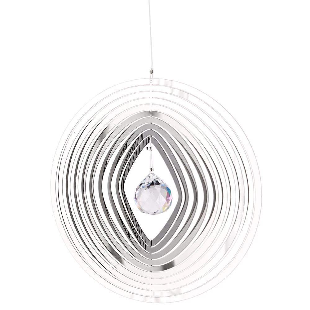 Designed for the traditionalist, this circular suncatcher’s rings surround a crystal center. Together they reflect and sparkle, creating a breathtaking display of shimmering light. Comes with approximately 20 inches of line and an alligator clip, which makes hanging this pretty suncatcher a breeze. Dimensions: 5 in. Long, 25 in. Overall Length (with hanging line), made of polished stainless steel from Woodstock Chimes.