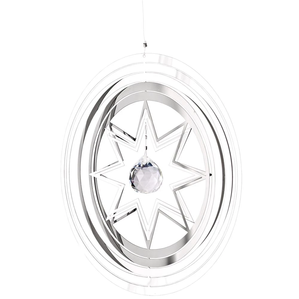 This circular suncatcher’s rings do double duty, surrounding both a silver star and its crystal center. Together they all reflect and sparkle, creating a breathtaking display of shimmering light. Comes with approximately 20 inches of line and an alligator clip, which makes hanging this pretty suncatcher a breeze. Dimensions: 5 in. Long, 25 in. Overall Length (with hanging line), made of polished stainless steel from Woodstock Chimes.