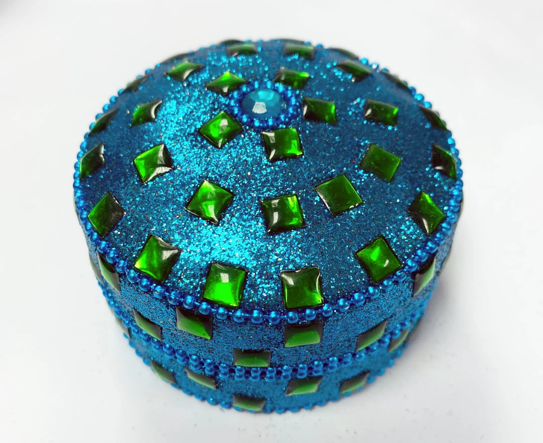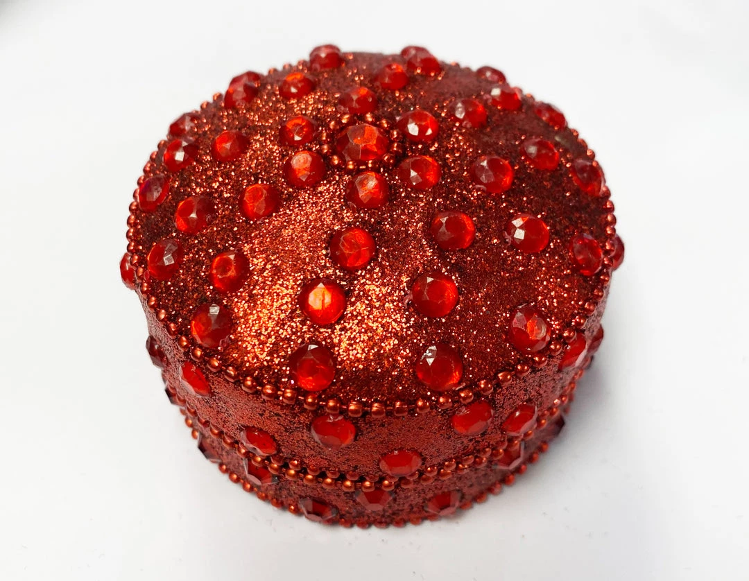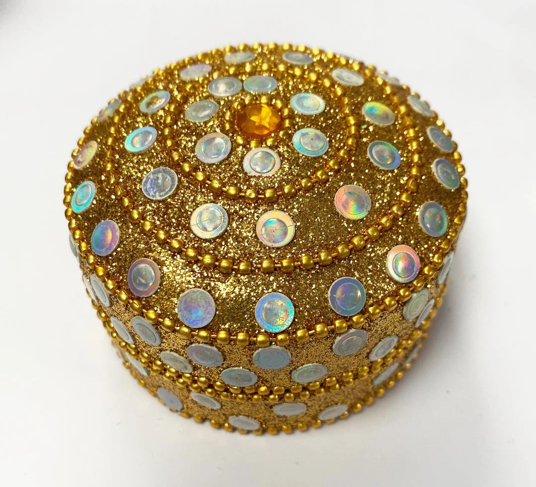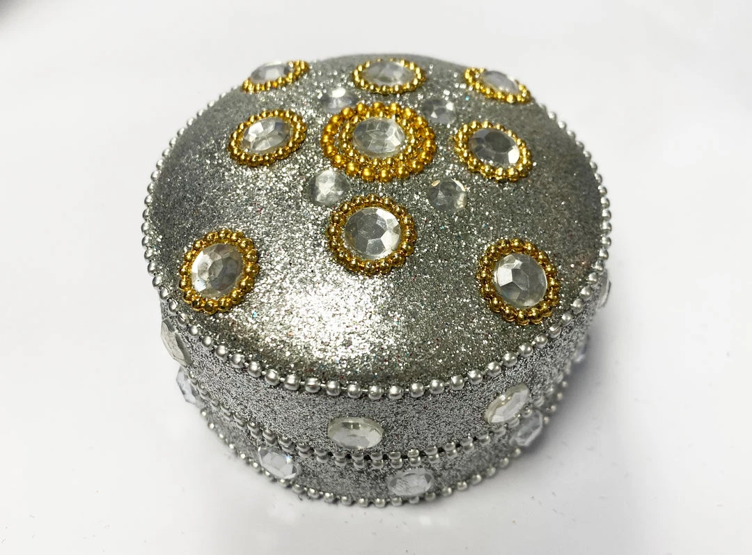 Add a touch of colorful sparkle! These boxes are 3″ diameter and large enough to hold several keepsakes, rings, etc. Assorted designs.