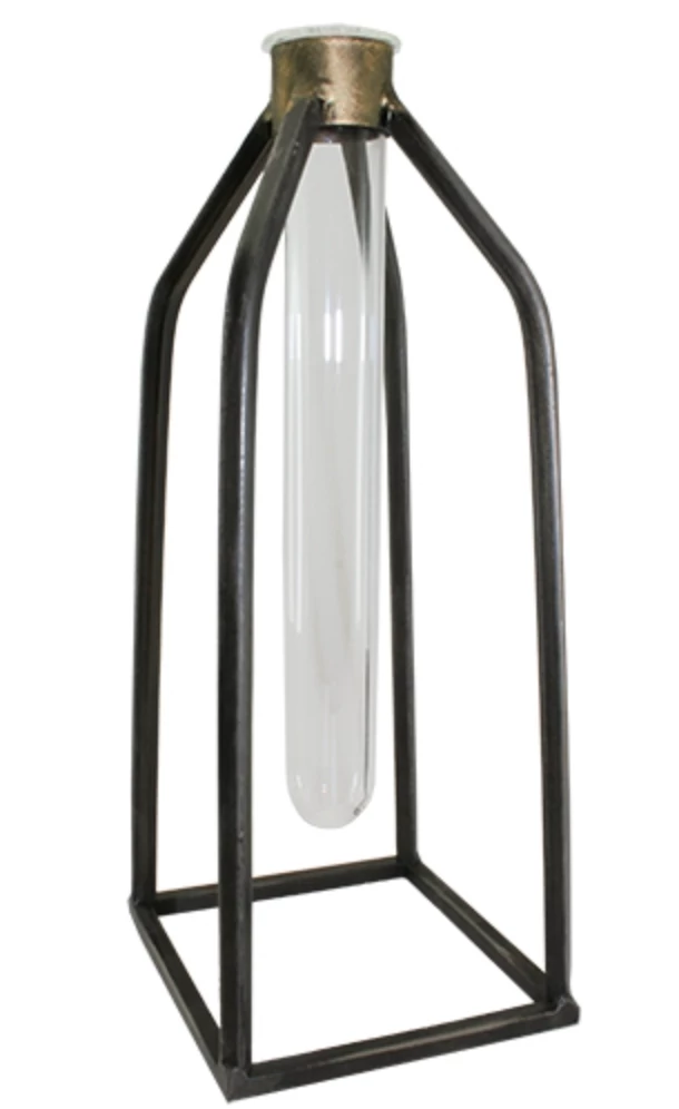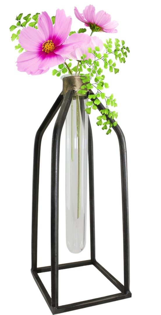 Unique and modern glass vase and metal stand. Get creative! Add single flowers, fern clippings, young palm fronds.. up to you!