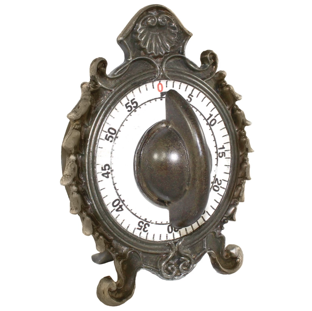 Vintage 1 hour dial timer. Antiqued metal. Style is that of an old piece. Face will show “wear”. Wind completely, then set timer.